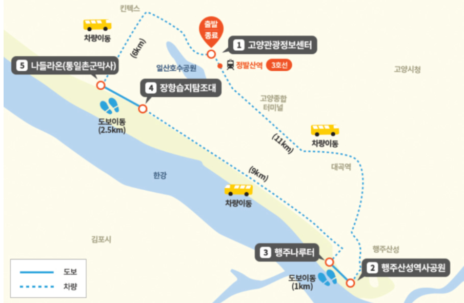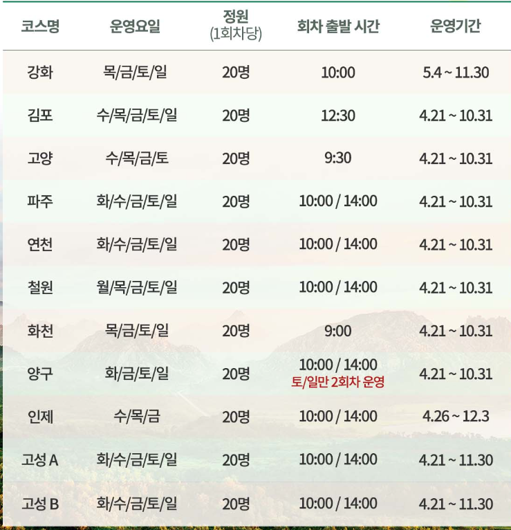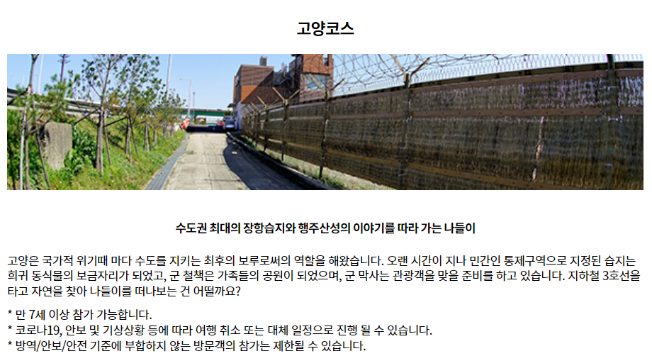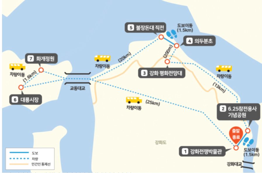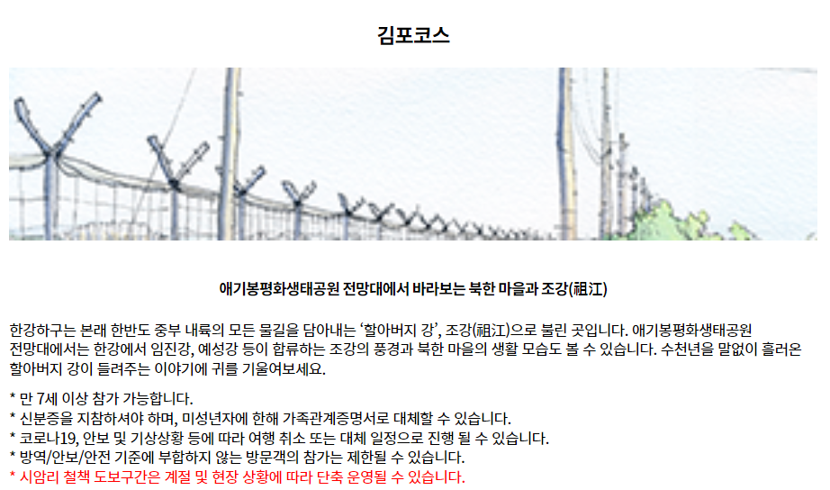인천·경기 지역에서는 장항습지와 행주산성을 함께 체험할 수 있는 ‘고양 코스’, 임진각과 도라전망대 등 대표적 평화관광지를 포함한 ‘파주 코스’, 삼국시대부터 대표적 군사 요충지였던 호로고루를 전망가능한 ‘연천 코스’ 옛 군사시설인 돈대와 실향민의 삶의 터전인 대룡시장을 체험할 수 있는 ‘강화 코스’, 임진강·예성강·한강이 합류하는 조강과 북한의 선전마을을 생생하게 바라볼 수 있는 ‘김포 코스’를 개방했습니다.