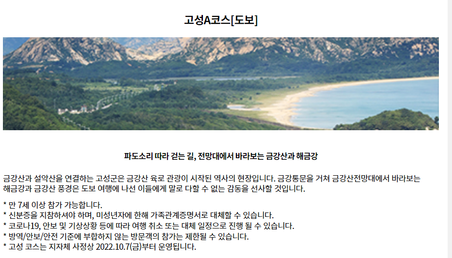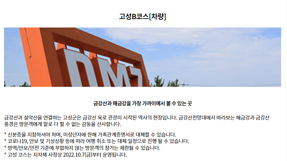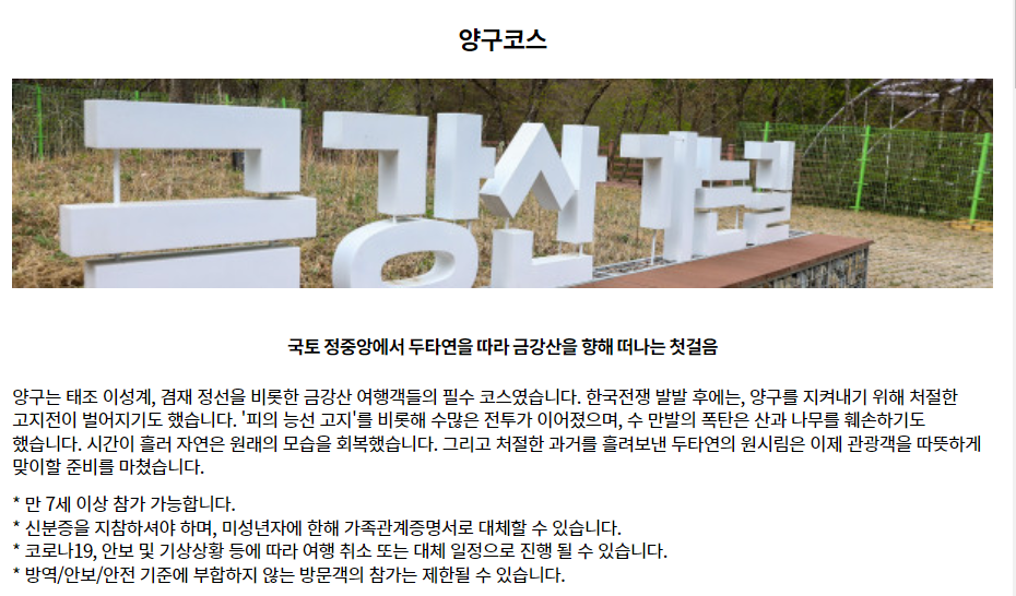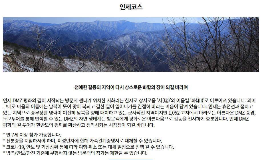 강원도에서는 가곡 ‘비목’의 배경이 된 백암산을 케이블카로 오를 수 있는 ‘화천 코스’, 백마고지 전적지를 살펴볼 수 있는 철원 코스 원시림인 두타연을 간직한 ‘양구 코스’, 백두대간의 아름다운 풍경을 한눈에 바라보는 ‘인제 코스’, 동해안을 따라 이어지는 해금강과 금강산을 함께 조망하는 ‘고성 코스’ 등을 체험할 수 있습니다.