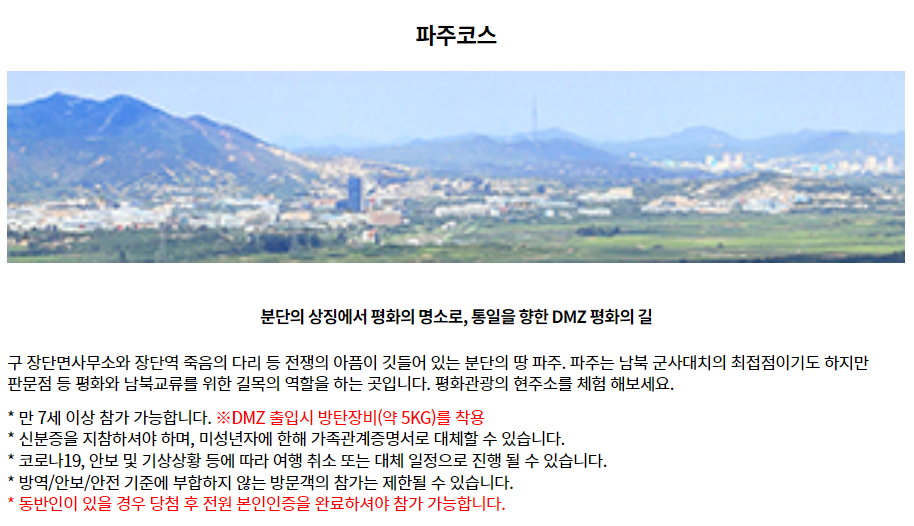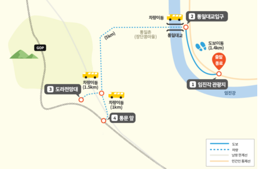 참가자들은 마을주민 또는 가이드와 안내요원과 함께 접경지역 DMZ에서만 볼 수 있는 관경을 관람합니다.