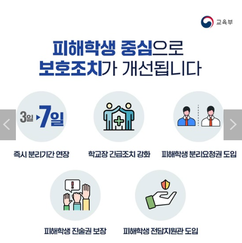 학교장 긴급조치 강화, 피해학생 분리요청권 도입, 피해학생 진술권 보장, 피해학생 전담지원관 도입 등