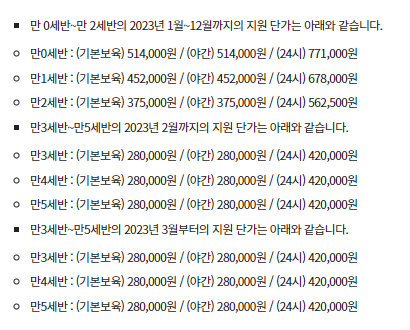 2023년 기준으로 측정되며, 나이에 따라, 기본교육 또는 야간, 24시 시간에 따라 금액이 변동되므로