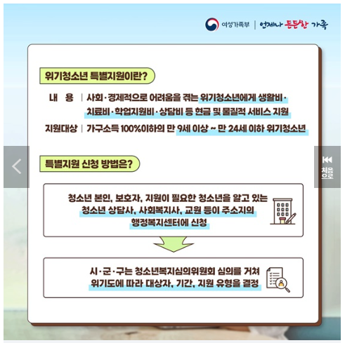 여성가족부 청소년 특별 지원금 홈페이지에 자세한 내용이 있습니다.