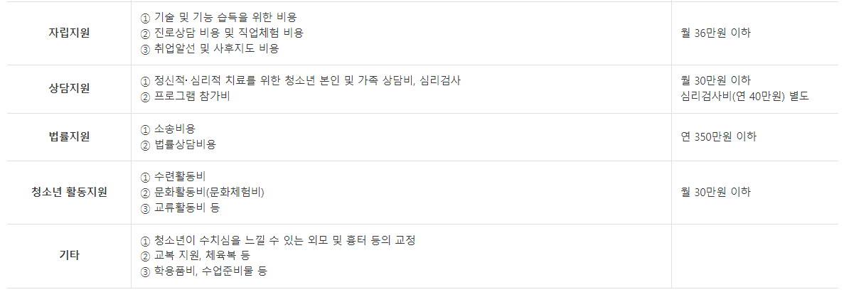 • 학업지원 (월 15만원 - 수업료, 월 30만원 이하 - 검정고시)