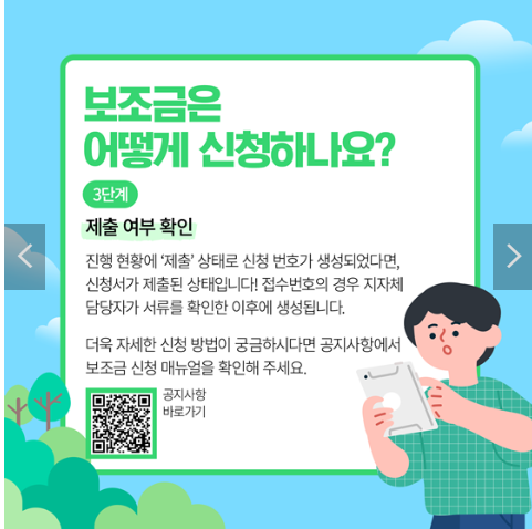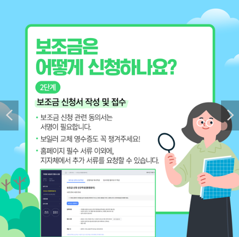 먼저 신청하기 홈페이지를 들어가 주신 다음 보조금 신청서 작성 및 접수를 해주시기 바랍니다.
