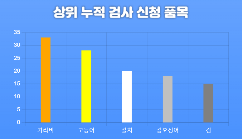 현재는 가리비, 고등어, 갈치, 갑오징어, 김 등이 상위권을 차지하고 있습니다.
