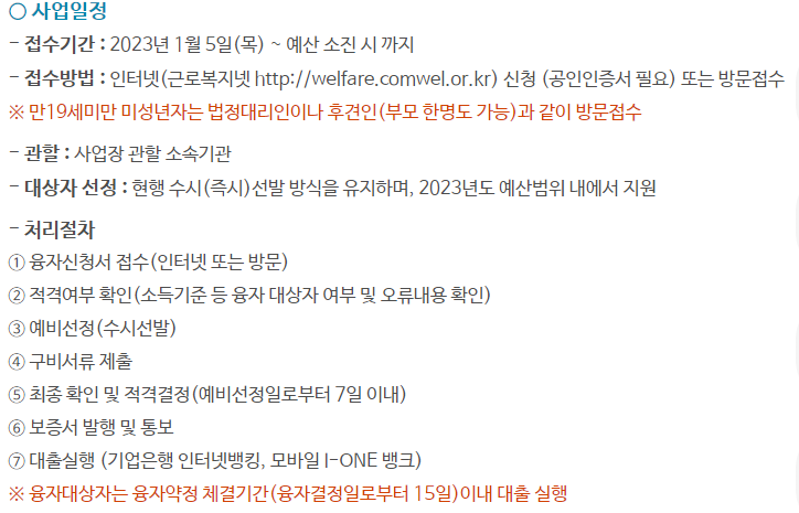 - 상환 : 1년 거치 3년 또는 1년 거치 4년 원금균등분할상환 중 선택 (소액생계비는 1년 거치 1년 상환)