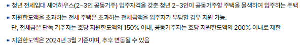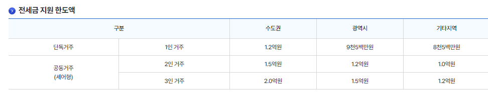 전세금 지원 한도: 지역에 따라 구분되며, 단독거주와 공동거주(셰어형)에 대한 지원한도가 설정되어 있습니다.
