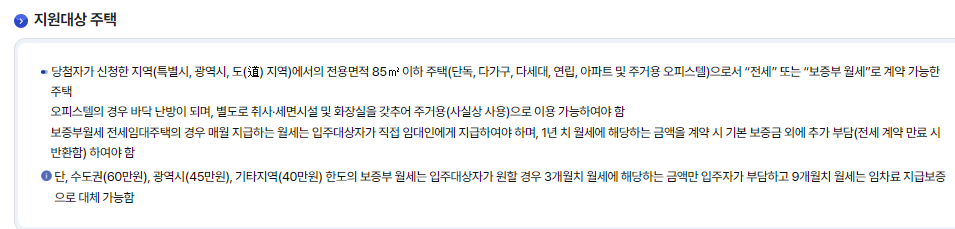 전용면적: 85㎡ 이하의 주택으로, 단독, 다가구, 다세대, 연립, 아파트, 주거용 오피스텔이 포함됩니다.