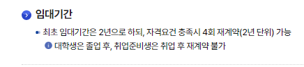 임대기간: 최초 임대기간은 2년이며, 자격요건 충족 시 4회 재계약(2년 단위) 가능하며 대학생의 경우 졸업 후, 취업준비생의 경우 취업 후 재계약이 불가능합니다.