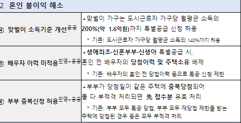 또한, 신혼특공의 소득 및 자산 기준이 상향 조정되어 더 많은 가정이 혜택을 받을 수 있게 되었습니다.