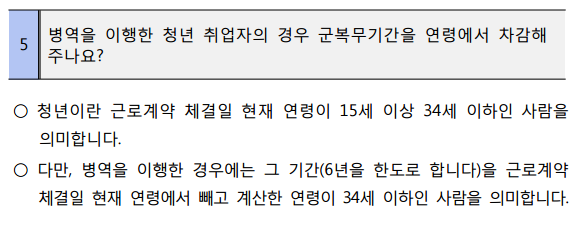 청년: 현재 근로계약 체결일 기준으로 15세부터 34세 이하로 취업한 경우.