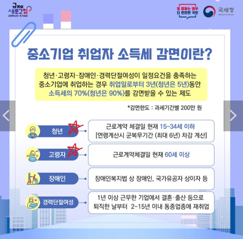 중소기업 취업자 소득세 감면은 청년, 고령자, 장애인, 경력단절 여성이 일정 요건을 충족하는 중소기업에 취업할 경우,