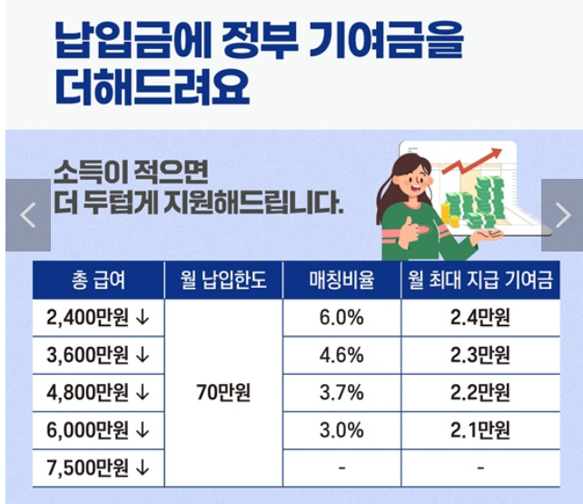 총 급여를 기준으로 월 최대 지급 기여금이 달라지며, 월 납입한도는 70만원으로 지정되었습니다.
