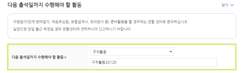 구직활동은 실업급여 수급에 중요한 부분이므로 빠짐없이 정확하게 기입해야 합니다.