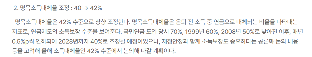 또한 은퇴 전 소득 대비 연금으로 대체되는 비율을 나타내는 명목소득대체율은 40%에서 42%로 상향 조정할 계획입니다. 이러한 개편은 국민연금이 재정적으로 안정되면서도,