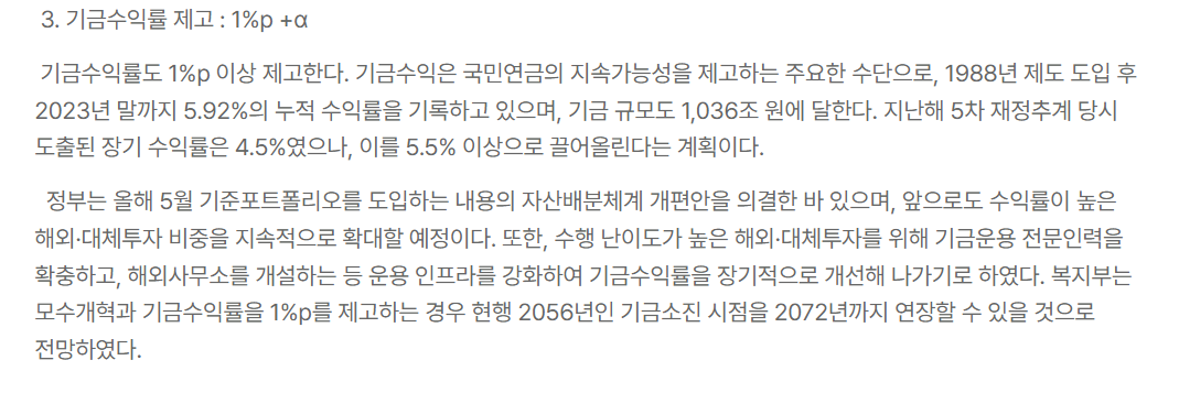정부는 국민연금 기금의 수익률을 1%p 이상 높여, 현행 5.5% 이상의 수익률을 달성하겠다는 계획을 밝혔습니다.