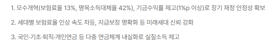 이 개혁안은 국민연금뿐만 아니라 기초연금, 퇴직연금, 개인연금을 포함한