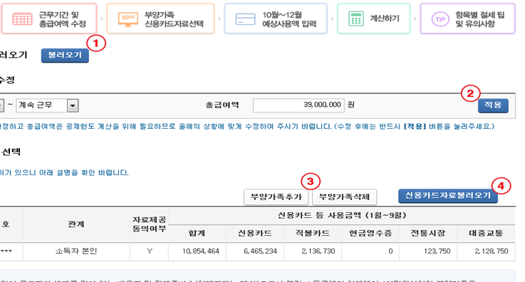 10월~12월 신용카드 사용 예상 금액 입력 계산하기 선택