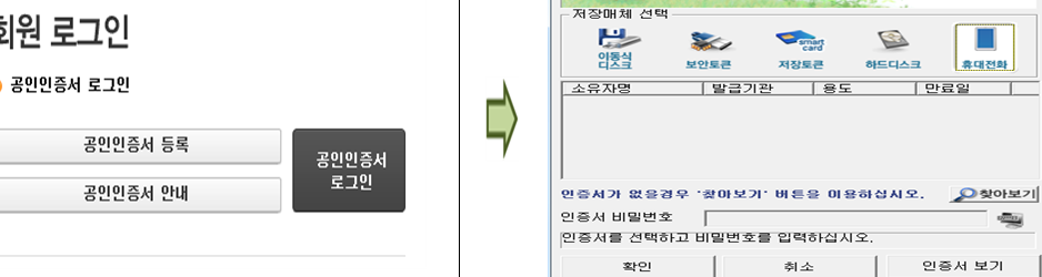 비회원: 성명과 주민등록번호를 입력한 후 공인인증서로 접속하여